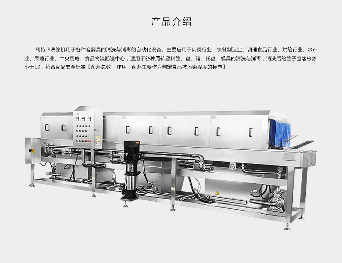 3、漂洗段:將筐子表面殘留的污漬漂洗掉,達到表面無殘留,同時對筐子消毒殺菌。